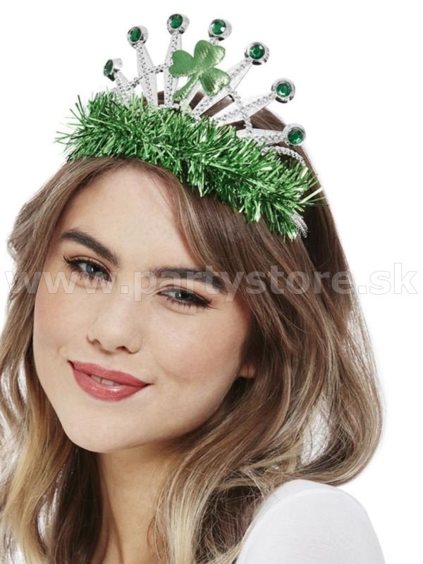 Strieborná korunka tiara z plastu na Deň svätého Patrika so zelenými ozdobnými kameňmi, zelenou trblietavou fóliou a trojlístkom. Čelenka je ideálnym štýlovým doplnkom pre dámy na pravú Írsku párty - Deň svätého Patrika.