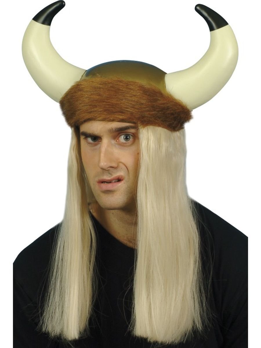 Helma - VIKING - hnedá s rohmi, kožušinový lem + dlhé blond vlasy