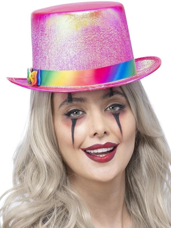 - 1 ks perleťovo ružový klobúk - cylinder s dúhovou stuhou