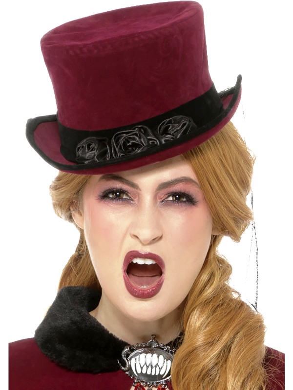 Luxusný bordový cylinder viktoriánskej upírky so závojom.