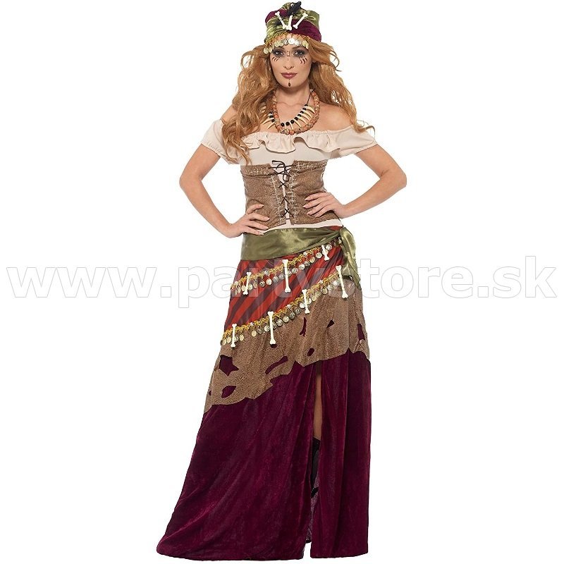 Tento luxusný kostým pre kňažnú Voodoo obsahuje viacfarebné šaty s topom v štýle Bardot a koženým korzetom na zaväzovanie. Stredná polovica sukne je pokrytá prúžkovaným materiálom z hadej kože, zdobená mincami a kosťami. Spodná polovica šiat je ušitá z bordového zamatu s vysokým rozparkom na stehne na jednej strane. Kostým je doplnený korálkovým a kosteným náhrdelníkom, olivovozelenou šerpou a čiapkou.
