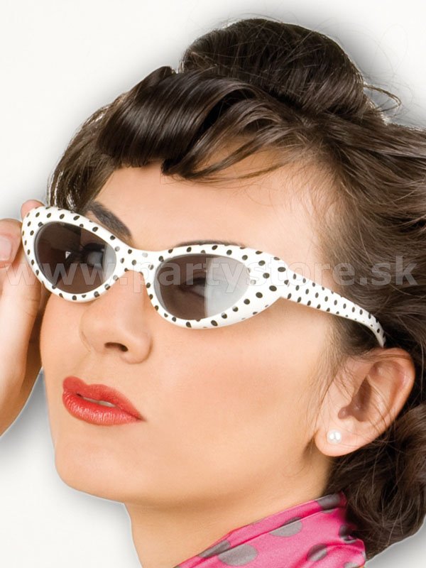 - 1 ks tmavé slnečné párty okuliare s bielym plastovým rámom s čiernymi bodkami