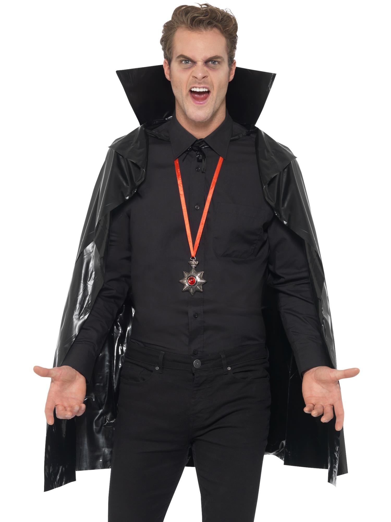 Jednoduchý čierny plášť z nepremokavého PVC materiálu s vysokým stojacím golierom je ideálnym doplnkom upírskych kostýmov na karneval, maškarný ples alebo Halloween. Jedna - univerzálna veľkosť. Dĺžka plášťa cca 115 cm.